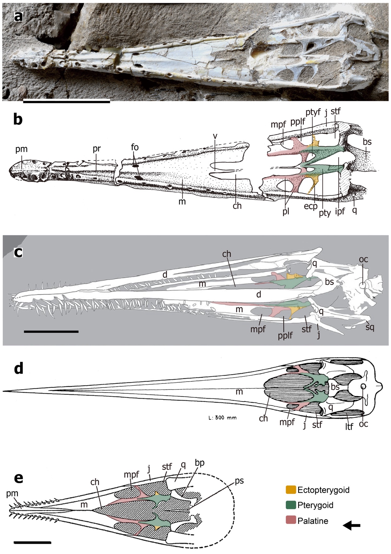 研究还发现腭区的上颌骨腭骨窗这一新结构,为翼龙类群区别于其它双孔类群的另一新特征。关于这一结构的起源演化,以及翼龙腭区的早期特征,则需要找寻更多相关化石进一步研究。本次关于翼龙腭区骨骼结构关系的新认识,将会为翼龙发系统发育,以及咬合力的功能形态学等方面提供更多的基础信息。