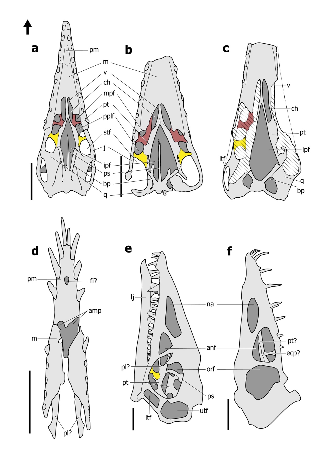 a喙嘴龙(改自Witmer et al., 2003);b卡其布翼龙(改自Gasparini et al., 2004)c双孔翼龙成员(改自Newton, 1888);d矛颌翼龙(改自Ősi et al., 2010);e曲颌形翼龙(改自Padian, 2008);f掘颌翼龙(改自Wellnhofer, 1975)(古脊椎所供图)