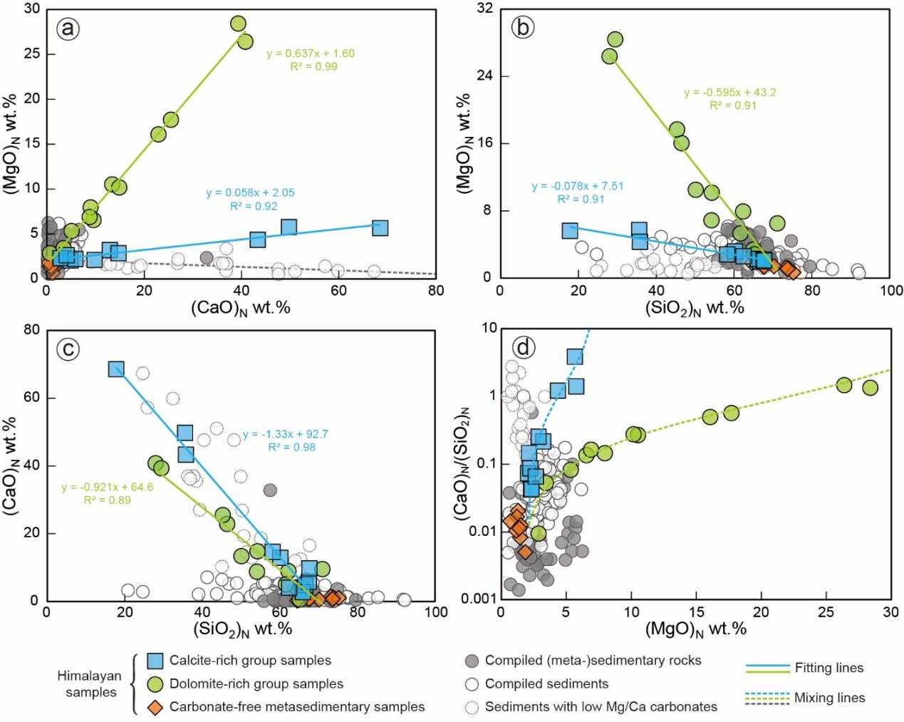 图1 (a-c)喜马拉雅变沉积岩样品(CaO)N, (MgO)N和(SiO2)N 含量间回归分析。灰色的线代表硅酸盐碎屑端元和低镁方解石(Mg/Ca = 0.002)之间的混合趋势。(d) 硅酸盐端元和方解石端元以及白云石端元之间的(MgO)N和 (CaO)N/(SiO2)N混合关系图。