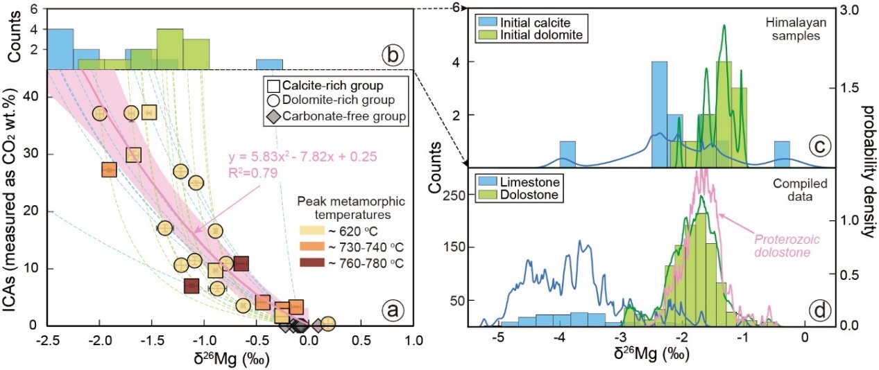 纯碳酸盐在大陆地壳中具有极高的热稳定性。相比之下,含碳酸盐的变沉积岩在较低的温度下就可以发生热脱碳作用。变质岩中残余碳酸盐丰度可以直接观察,因此估计陆壳碳保存效率的关键在于如何获得变沉积岩的初始碳酸盐含量(ICA;即热脱碳前原岩中的碳酸盐丰度)。然而,对于经历过高级变质作用、地壳深熔和熔体提取的变质岩样品而言,常规的元素数据很难反演其原岩中的初始碳酸盐含量。因此,亟需一种可以免受上述地质过程干扰的示踪工具。鉴于碳酸盐矿物和硅酸盐矿物之间显著的镁同位素组成差异,以及部分熔融过程中有限的镁同位素分馏 (Teng,2017),镁同位素可能是定量示踪变沉积岩样品中初始碳酸盐含量的潜在工具。