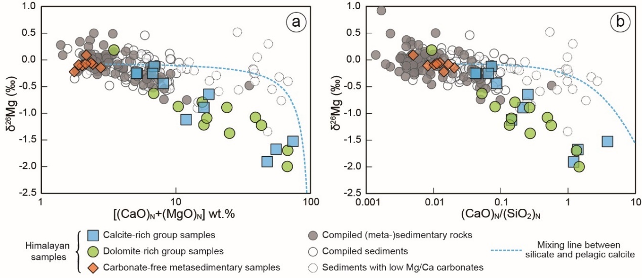 图3 喜马拉雅变沉积岩数据与全球含碳酸盐沉积物以及 (变)沉积岩数据间的对比。虚线为硅酸盐碎屑端元与低Mg方解石 (δ26Mg: -4.72 ‰, Mg/Ca = 0.002) 之间的混合线。