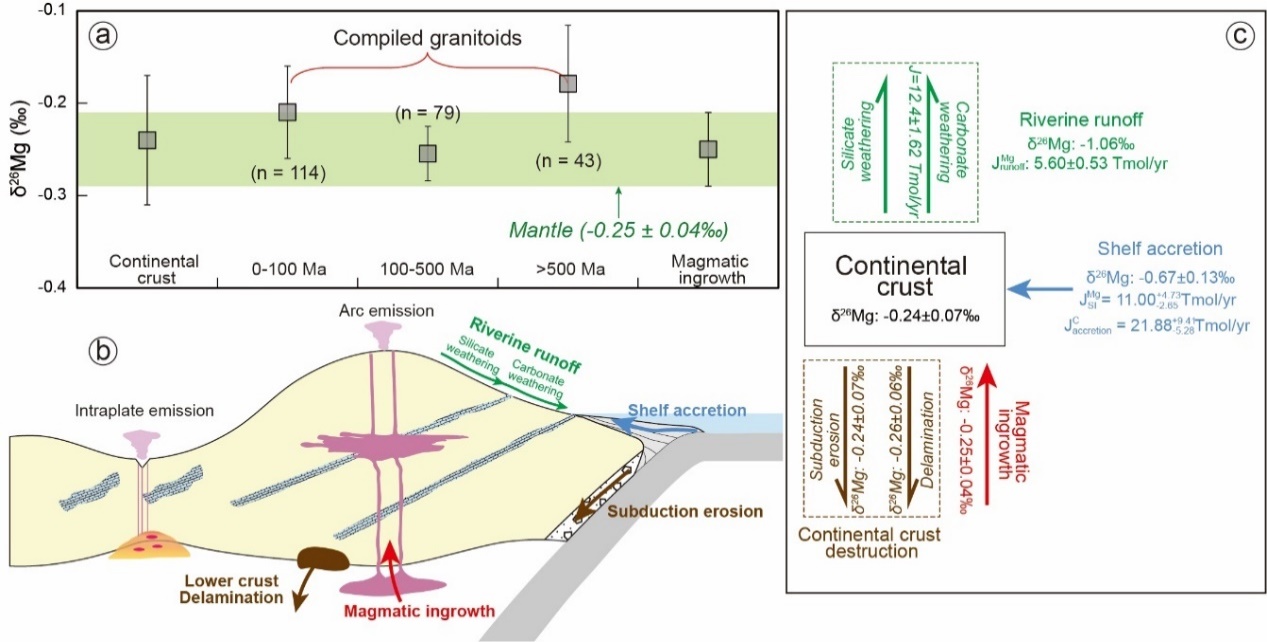 图4 (a) 地质历史上不同时间范围内全球花岗岩类岩石δ26Mg的加权平均值。(b, c)稳态箱形模型的卡通图 (b) 和示意图 (c)。