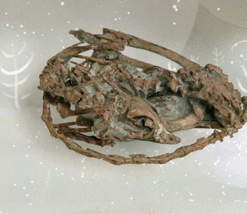 图片中是一件寐龙的化石标本。标本显示寐龙采用了和鸟类一模一样的睡姿,从行为学的角度指示了小型兽脚类恐龙有可能是恒温动物,甚至是内温动物。