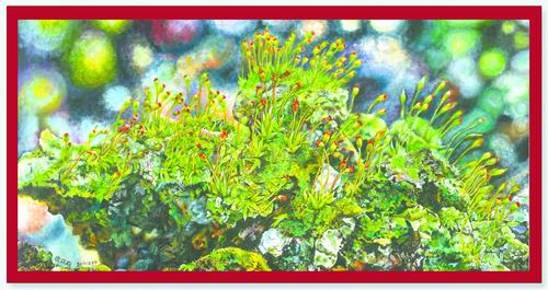 东喜马拉雅地区位于世界屋脊青藏高原的南缘,是举世瞩目的生物多样性热点,至少有8000余种维管植物和500种藓类植物分布于此。在名为《印象:东喜马拉雅》的科学画中,作者将37种生长于东喜马拉雅地区的苔藓植物,融合在一张画中,其中既包含特有种,也描绘了广布种。