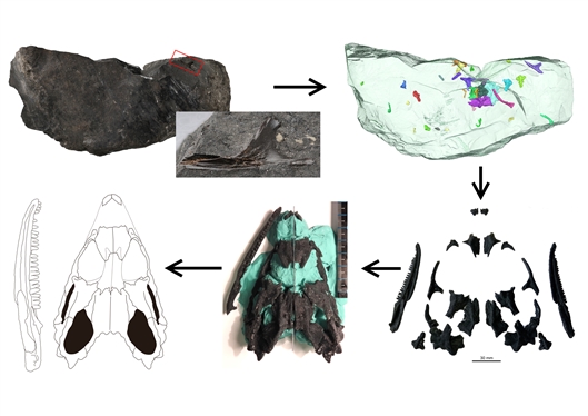 据悉,沙海组产出的脊椎动物化石多为零散骨片,团队在黑山龙标本表面也只看到了一个齿骨和一个颧骨。通过高精度CT扫描在岩石内部发现了更多骨片,包括小半个头骨和一些零散骨片。研究人员对扫描数据建模,再虚拟放大、镜像模型后进行3D打印,最终恢复出侏儒黑山龙的大部分头骨结构。与侏罗纪的栉颌鳄和青龙相似,黑山龙吻短、下颞孔未闭合。根据下颌长度推测,侏儒黑山龙的体长约30厘米,与栉颌鳄和潜龙的大小相当。
