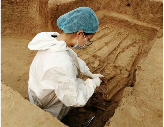 ▲研究人员在考古发掘现场取样