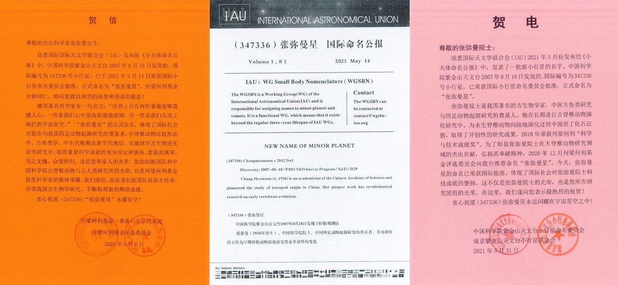张弥曼院士因其卓越科研成就荣获何梁何利基金2018年度“科学与技术成就奖”,2020年12月被何梁何利基金会推荐为国际小行星命名的候选人,于2021年5月14日荣获批准。以她的名字来命名永恒的行星,体现了国际社会对张弥曼院士学术成就与科学精神的褒奖与发扬,也是对从事古脊椎动物与古人类学研究工作者极大的精神鼓舞。(总台央视记者 帅俊全)