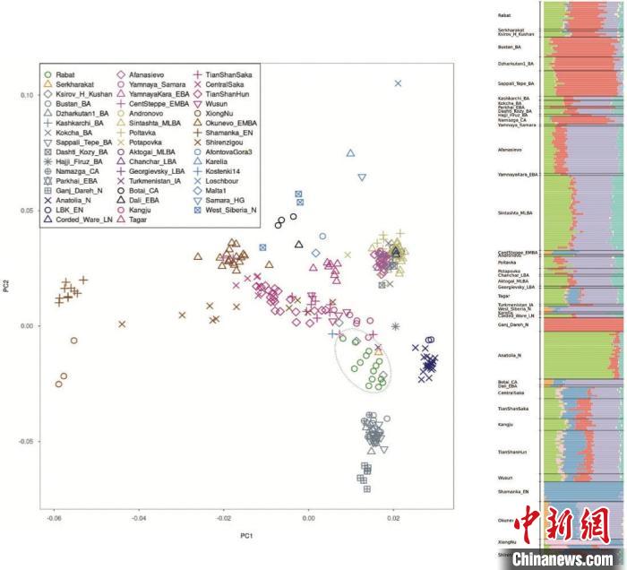 论文第一作者、中科院古脊椎所副研究员维卡斯·库马尔(Vikas Kumar)说,最新的古基因组研究显示,月氏文化下的拉巴特古人群除含有伊朗农业人群、安纳托利亚农业人群、欧亚草原牧民遗传成分外,还含有少量欧洲西部、东亚、南亚狩猎采集相关人群的遗传成分。