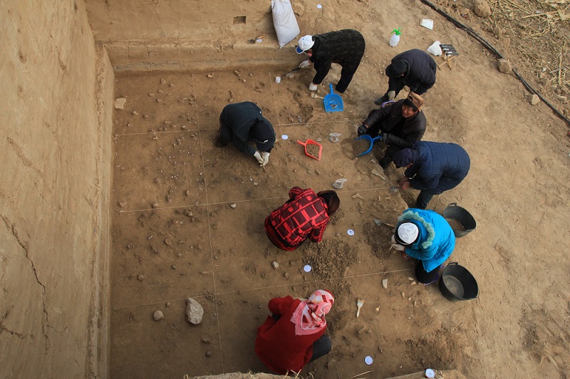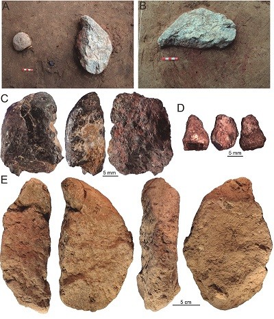 “我们在这个仅有12平米大的主文化层里,看到了一处红色的富集赤铁矿的染色区,但这个发现并不足以证明一定是人为加工留下的。”王法岗说。