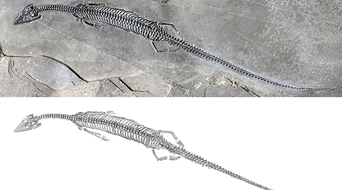 华南三叠纪海相地层分布广泛,保存有数量多、门类丰富的海生爬行动物化石,为研究当时海洋生态系统的构成、食物网和营养级提供了良好的条件。长尾红河龙发现于云南省红河州泸西县中三叠世早期海相地层,全长47厘米,体形像水生蜥蜴,由69块脊椎骨组成的尾巴特别引人注目。