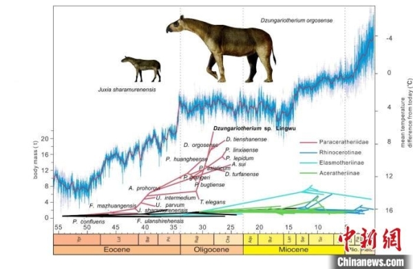 巨犀体型演化复原图及其与气候环境的关系。邓涛团队 供图