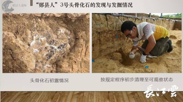 发布会介绍,此次发现的“郧县人”3号头骨化石被埋藏于学堂梁子遗址内有一定钙质胶结的砂土地层中,目前已清理出露额骨(包括眉脊)、眼眶、顶骨、左侧颧骨和颞骨及枕骨左侧。化石出露部分保存完好,形态清晰,人类属性确凿。难能可贵的是,该头骨形态基本正常,没有发生明显的变形,所能提供的性状信息比此前在该遗址发现的另外两具头骨更丰富而真实,会在很大程度上弥补前两具头骨变形的缺憾。