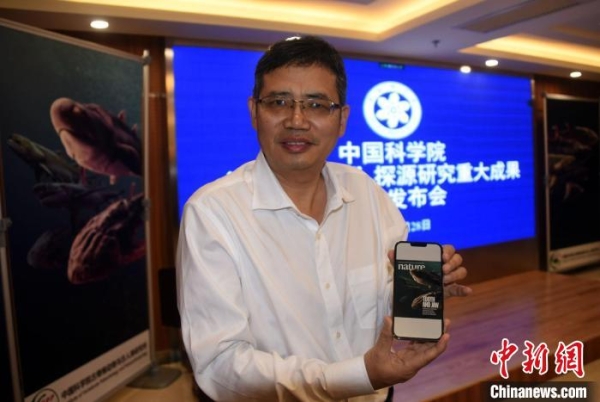 朱敏院士展示“从鱼到人”探源研究成果论文的《自然》封面图片。 中新社记者 孙自法 摄