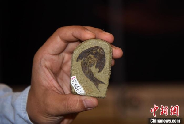 科研人员展示本次研究的一件古鱼化石标本。 中新社记者 孙自法 摄