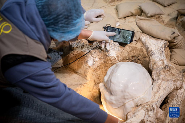 12月3日,考古队员在提取头骨化石。新华社记者 伍志尊 摄