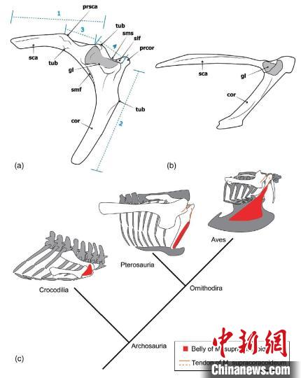 一是形态学研究方面,通过对哈密翼龙肩带进行计算机断层扫描(CT)三维模型重建和形态学分析表明,翼龙喙上肌如同鸟类一样绕行顶乌喙突内侧连接肱骨近端,顶乌喙突可实现类似的滑轮功能,翼龙可能如鸟类一样利用喙上肌收缩实现翅膀上扬。