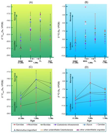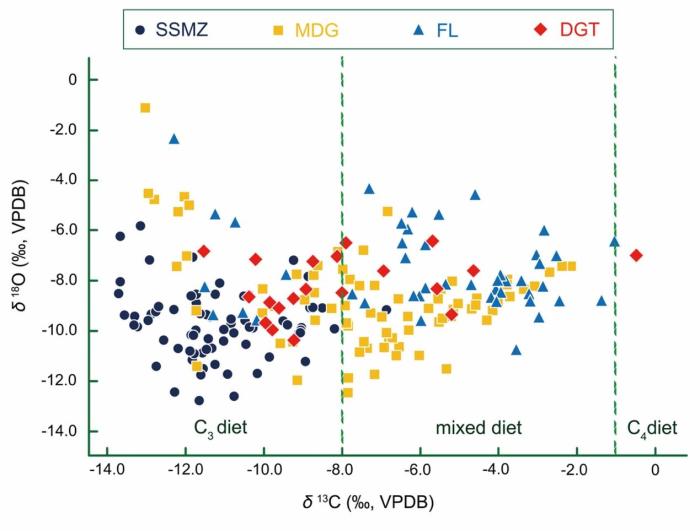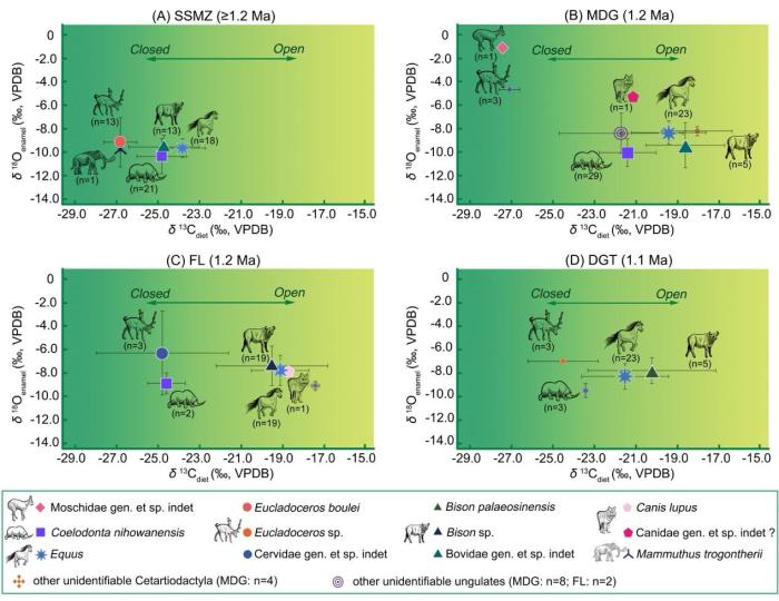 这次合作研究选取上述四处早更新世遗址的哺乳动物牙釉质,采取稳定同位素分析,重建MPT初期前后,泥河湾盆地区域环境的历时性变化情况,并进一步尝试探索MPT初期东北亚中高纬半干旱地区人类行为适应与生态变化之间的联系。牙釉质整体取样结果表明,泥河湾盆地的区域生态景观发生了较大变化,从120万年之前以较密闭和湿润的纯C3植被为主的景观,转变为距今120万-110万年期间以开放和干燥的C3/C4混合植被为主的生态景观类型。牙釉质序列取样结果表明,相关区域环境经历着季节性变化,整体环境呈现多变的特征。
