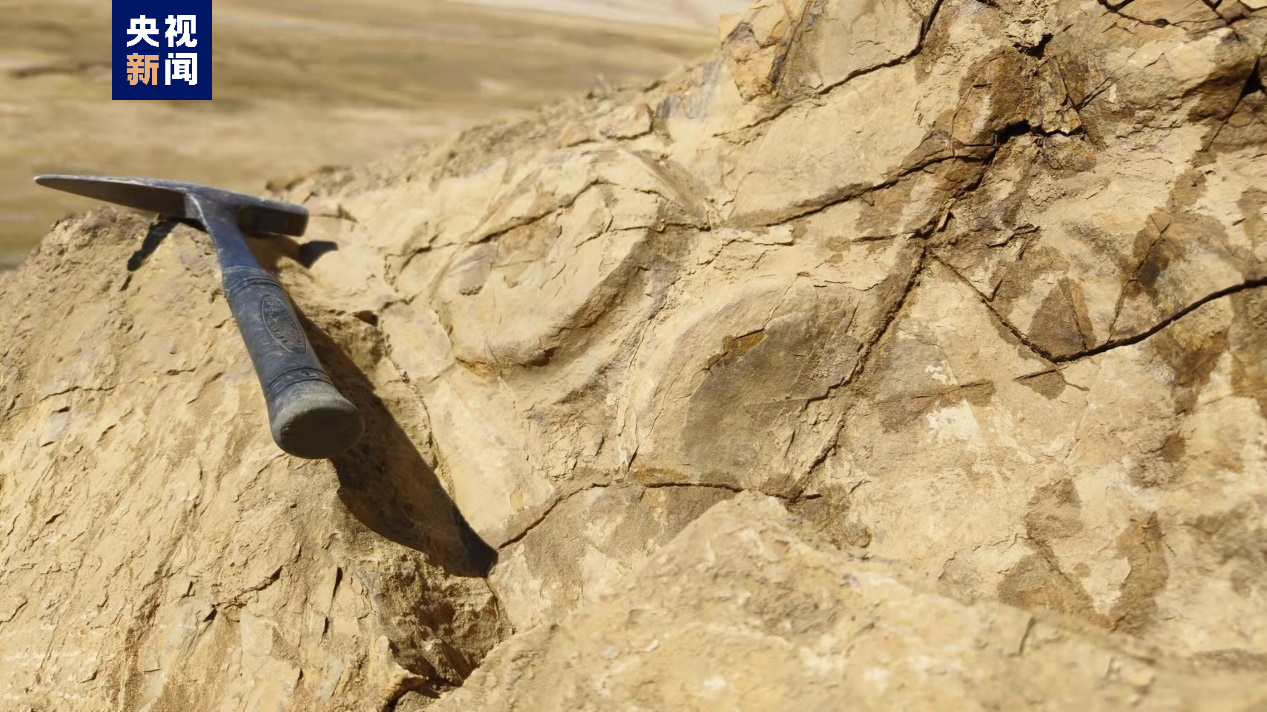 西藏定日地区三叠纪曲龙共巴组岩层中的鱼龙化石椎体(图中圆盘状物体)和肋骨