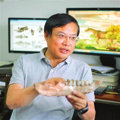 我紧走了几步,“躲”进邓涛的办公室。一具史前巨兽庞大的下颌骨在摞起的书堆边格外醒目,我蹲下来抚摸它光滑的牙齿。邓涛说,这是巨犀,生活于3000万年前,体重可达24吨,是现在非洲象的四倍。这个穿越而来的庞然大物其实还是个“小宝宝”,因为它乳牙尚在,没到换牙的年龄。整整一下午,哪怕拿起一块化石碎屑,邓涛都能讲上一段精彩的地球往事。