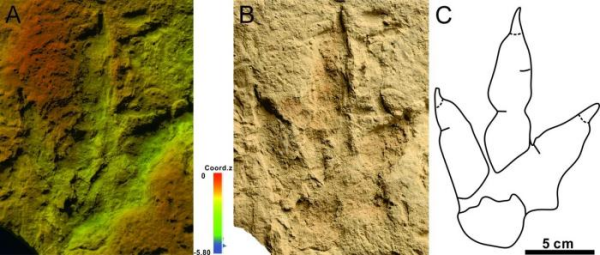 保存完好的哈密兽脚类恐龙足迹化石(A.?伪彩色深度图;B.?标本照片;C.?线条图)。汪筱林团队/供图