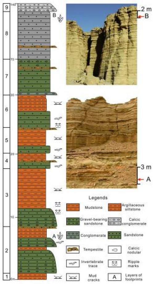 哈密兽脚类恐龙足迹的发现,进一步扩大了该类型足迹的分布范围,也为哈密翼龙动物群兽脚类恐龙身高体长等提供足迹学依据。同时,结合地层层序、沉积特征及无脊椎动物遗迹化石等的发现,研究团队推断这些足迹是由小型兽脚类恐龙在湖岸行走所留。
