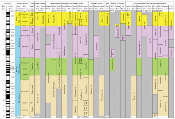 中国的新近纪年代地层系统分为中新统的谢家阶、山旺阶、通古尔阶、灞河阶、保德阶5个阶,以及上新统的高庄阶和麻则沟阶2个阶。研究提出,在青藏高原新生代陆相地层的划分对比和测年标定上,哺乳动物化石起到非常重要的作用。