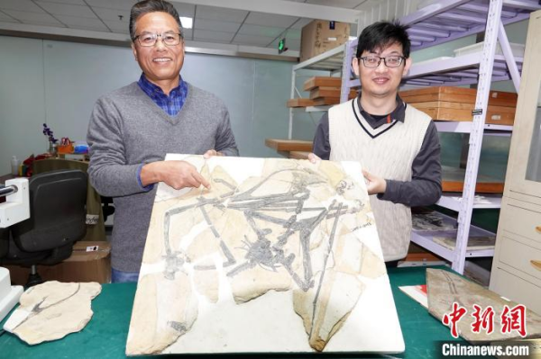 12月25日,汪筱林研究员(左)、蒋顺兴副研究员展示介绍友好美丽飞龙化石模式标本。中新社记者?孙自法摄