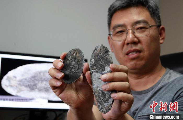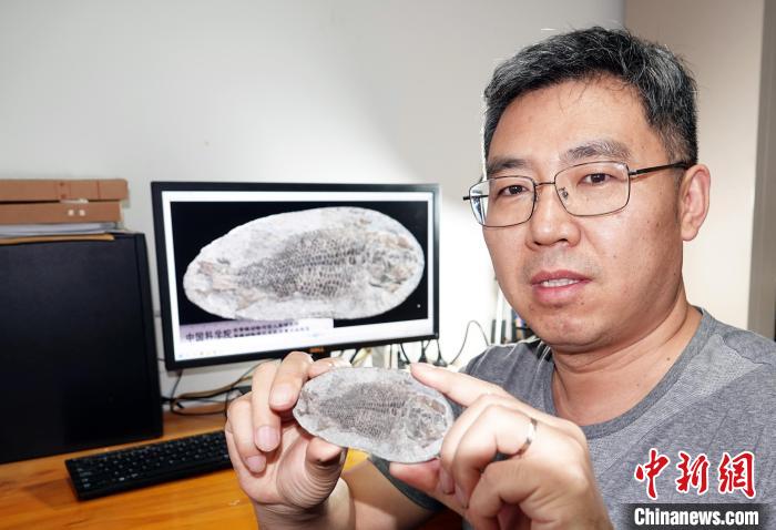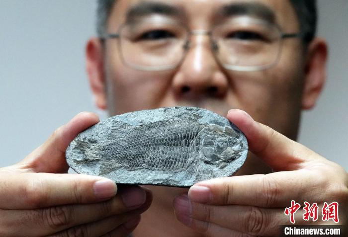 徐光辉研究员展示此次研究发现的距今约2.49亿年的“吴氏三叠鱼”化石模式标本。中新网记者 孙自法 摄