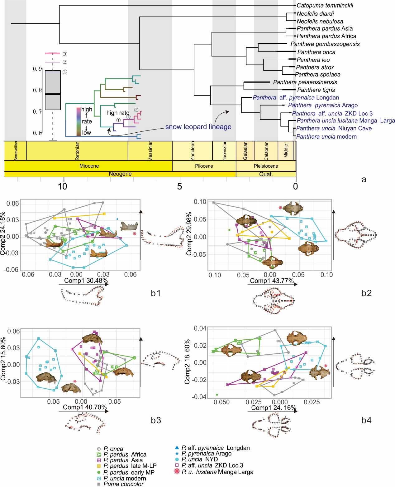 江左其杲指出,结合DNA序列和形态学数据,研究团队推断豹属的系统发育,支持5例化石记录的确属于现生雪豹支系,且它们相对现生雪豹组成并系群,表明这些青藏高原之外的雪豹并非独立于现生雪豹的一个分支,而是不断从雪豹主干上分出的小分支,说明它们很有可能代表雪豹多次在特定时间段走出青藏高原的记录,而这些记录共同组成了雪豹演化的几个断面,从而得以揭秘雪豹如何一步步特化。