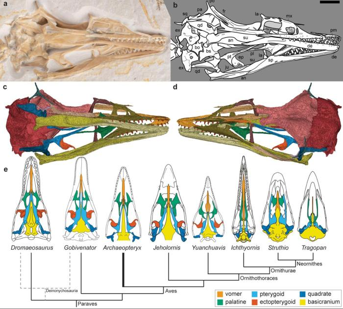 芝加哥始祖鸟的头骨三维模型及副鸟类腭区演化示意图。中国科学院古脊椎所 供图