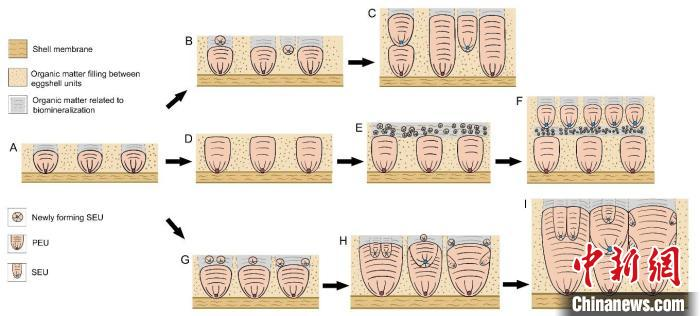 次生壳单元在手盗龙类蛋壳中逐渐消失的示意图。中国科学院古脊椎动物与古人类研究所 供图