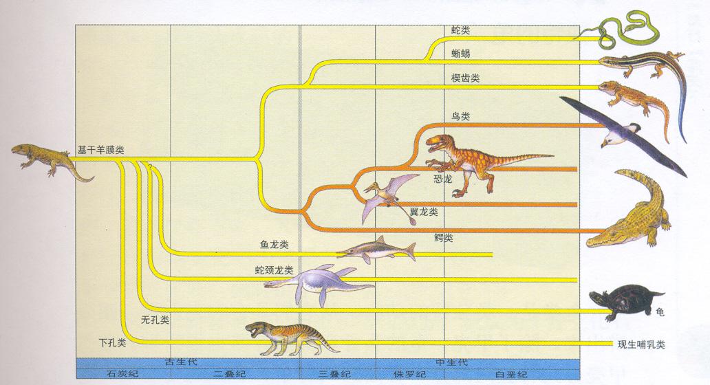 迷齿两栖动物在古生代晚期的石炭纪和二叠纪时,曾经一度繁盛。但在它繁盛初期时,就有一支已经进化为爬行动物。这支爬行动物逐渐崛起,最终在中生代一统天下。爬行动物形成的标志是羊膜卵的出现。 虽然两栖动物已经登上了陆地,但只有在羊膜卵出现后,脊椎动物才真正摆脱了(个体发育过程中)对外界水体的依赖,成为完全陆生的动物。羊膜卵的出现是脊椎动物进化史上继“颌的出现”、“从水到陆”之后的又一次重大的飞跃。 具有羊膜卵的脊椎动物统称羊膜动物。爬行动物和鸟类、哺乳类一起构成了羊膜动物。现代的羊膜动物都很好判断,只要看它们是否产羊膜卵就可以了。但要判断化石生物就有些困难了,因为我们无法直接从骨头上知道某类生物是否产羊膜卵。 大家公认的最早的蛋化石发现于三叠纪。有间接的证据表明,羊膜卵比目前已知的最早爬行动物出现得早。长期以来,蜥螈被认为是羊膜动物的祖先类型,因为它的骨骼构造兼备两栖动物和爬行动物的特征。但是由于它出现时间太晚(早二叠世),不大可能是爬行动物的直接祖先。在古生代的两栖动物中仅石炭螈类与羊膜动物最接近。