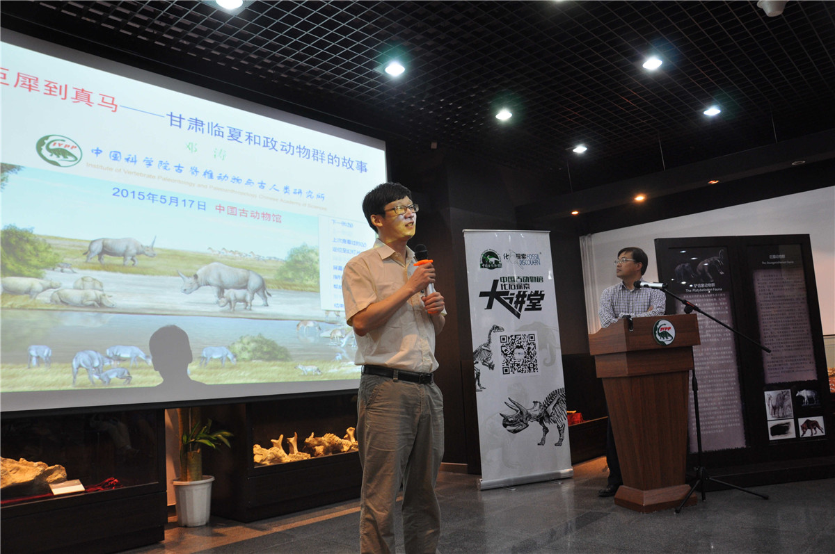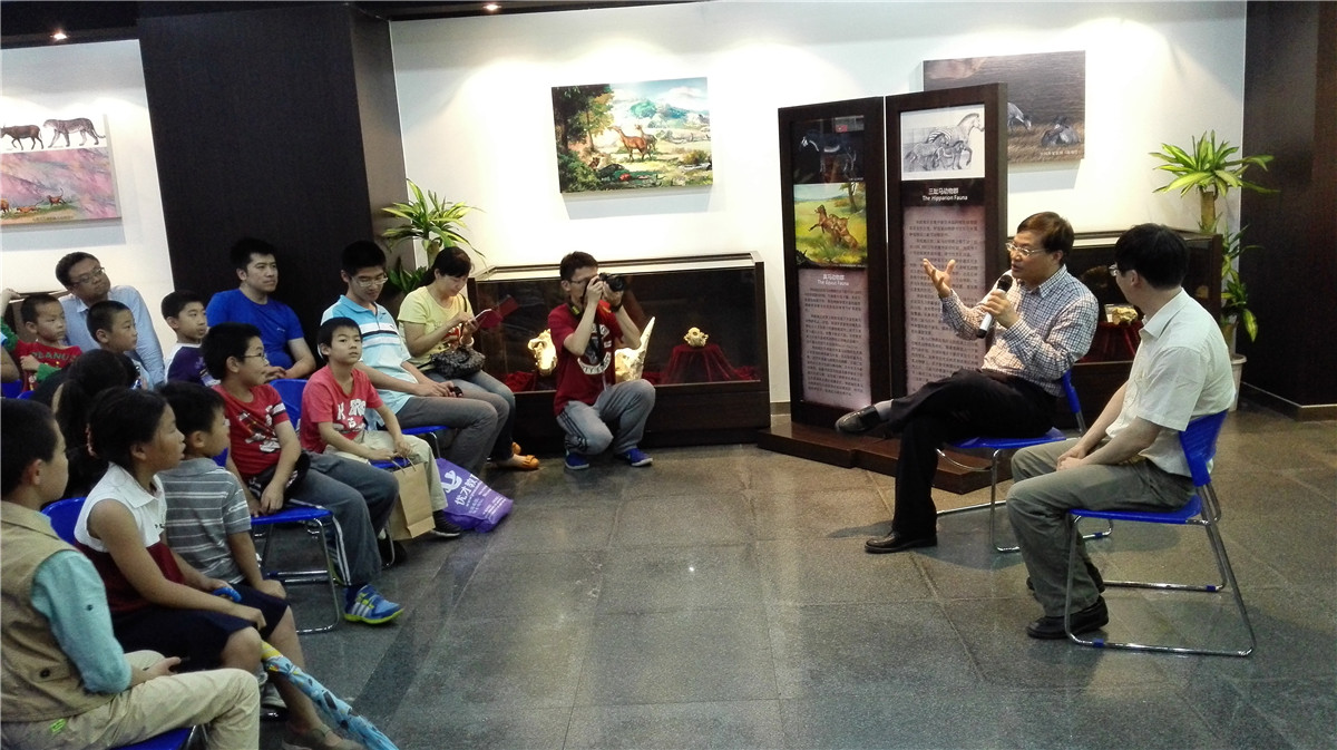 此外,中国古动物馆于17日下午在馆内东厅同时开展了“中国古动物馆——化石探索大讲堂”的第一期讲座活动,邀请邓涛研究员为小达尔文俱乐部会员及其他古生物爱好者讲述了“从巨犀到真马——甘肃临夏和政动物群的故事”。讲座由古动物馆馆长王原主持,听众置身于和政动物群化石展厅之中,跟随邓涛研究员,以和政古生物群的四大动物群为线索,重返这一新生代动物王国,领略了哺乳动物各家族三千万年以来的兴衰历史。而后的主持人专业访谈及观众提问环节中,邓涛研究员耐心回答了每位提问小朋友的问题,并与听众合影留念。大讲堂作为我所科研人员及相关领域专家对外进行科普的平台,将把最新的研究成果及研究中趣闻趣事介绍给公众,使公众在书籍及影视作品外,了解真实的古生物学研究过程。