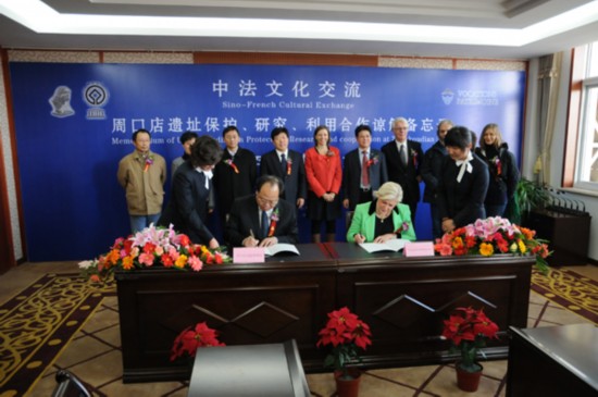 2009年12月3日上午,“中法文化交流——周口店遗址保护、管理、利用合作谅解备忘录签字仪式”在周口店遗址举行。此次中法文化交流是周口店遗址纪念“北京人”第一颗头盖骨发现80周年系列活动之一。房山区人民政府副区长卢国懿主持签字仪式。法国遗产行业基金会副主席兼秘书长贝阿特丽丝女士与周口店遗址博物馆馆长杨海峰签署“中法文化交流——周口店遗址保护、管理、利用合作谅解备忘录”。联合国教科文组织世界遗产中心亚太部项目主任景峰、国家文物局文化遗产处处长唐伟、法国史前国家博物馆馆长让.雅克.克莱亚特—梅尔、法国企业管理学院副院长奥利维尔.伊萨贝尔、法国遗产行业基金会项目经理玛丽—安德丽 克斯托尔、中国科学院古脊椎动物与古人类研究所研究员董为、周口店遗址博物馆副馆长董翠平及相关人员参加签字仪式。合作谅解备忘录内容包括:开展馆际交流与合作、联合拍摄纪录片、遗产地管理人员培训和继续发挥遗产行业基金会的作用,为周口店遗址地点保护募集资金四项内容。