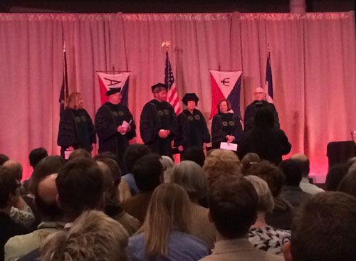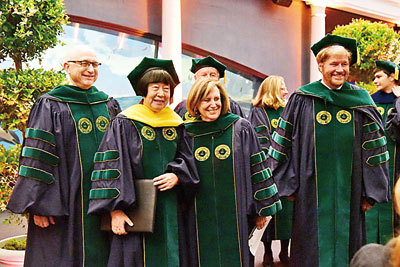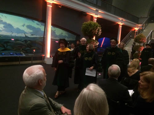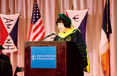 随着埃尔加《威仪堂堂》进行曲的旋律,张弥曼院士和纽约自然历史博物馆的高层主管以及研究生院院长、校董会成员步入大厅。自然历史博物馆研究生院教务长诺瓦切克(Michael J. Novacek)介绍说,张弥曼教授是杰出的古生物学家、地质学家和演化生物学家。她对古海洋学和古鱼类学的研究在学术上和实际应用上都有重要价值,在担任中科院古脊椎动物与古人类研究所所长期间,在教育年轻科学家和建立国际学术交流方面做出了杰出贡献,帮助中国的古生物学研究走上了世界先进行列。诺瓦切克称赞张弥曼教授是一位科学探索的开拓者、是在中国古生物与国际同行之间的搭桥人、更是一位具有勇气的带头人。他说纽约自然历史博物馆的研究生院很荣幸能授予张弥曼教授荣誉科学博士学位。张教授致辞时,首先祝贺获得博士学位和硕士学位的年轻学者。她表示,是自己对科研的热情让她克服了重重艰苦困难,取得了一些成果,她鼓励学子不要忘记初衷,保持探索大自然神秘的热情。她回顾了近一百年来,美国自然历史博物馆和古脊椎动物与古人类研究所及其前身的交流历史,并缅怀两国古生物学家界老前辈的贡献。她也指出,世界有国界,而科研没有国界,希望今后中美学术界之间能够更多交流。