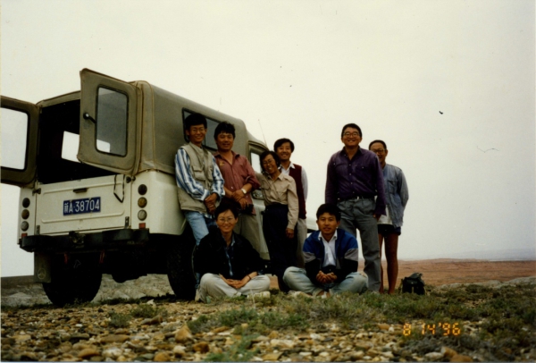 90年代新疆野外(前排左起:刘丽萍,毕顺东;后排左一为孟津,左三为吴文裕,左五为叶捷)(叶捷,吴文裕供图)