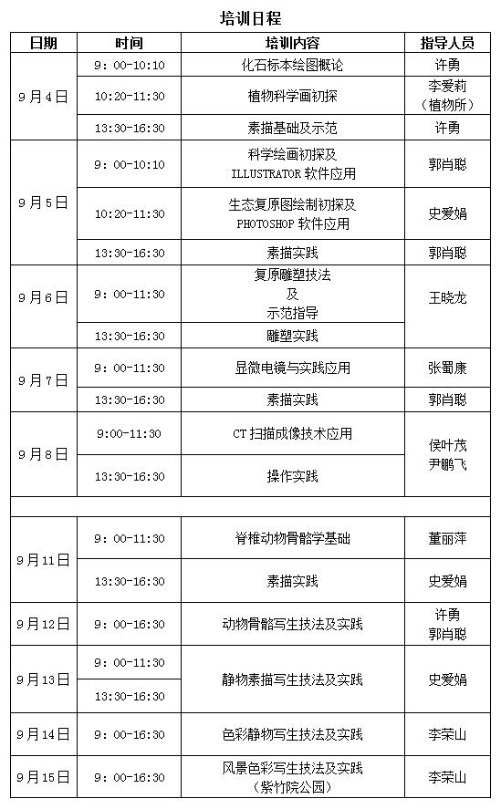 培训主要内容包括:标本绘图概论、骨骼写生技法、化石及旧石器绘图技法及应用、素描基础及实践、ILLUSTRATOR软件应用、PHOTOSHOP软件应用、脊椎动物骨骼学基础、显微电镜、CT扫描成像技术应用、复原雕塑技法、静物色彩、风景色彩写生技法及实践等。