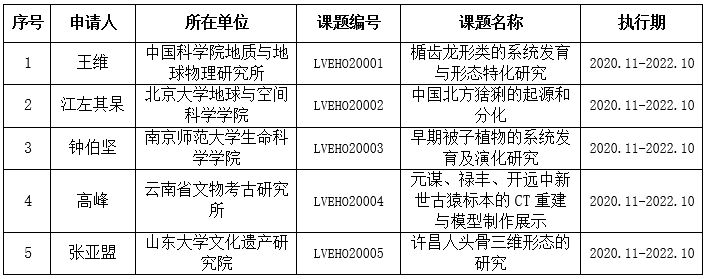 中国科学院脊椎动物演化与人类起源重点实验室2020年度开放课题经学术委员会专家审议,确定5项课题予以立项资助,具体立项课题如下: