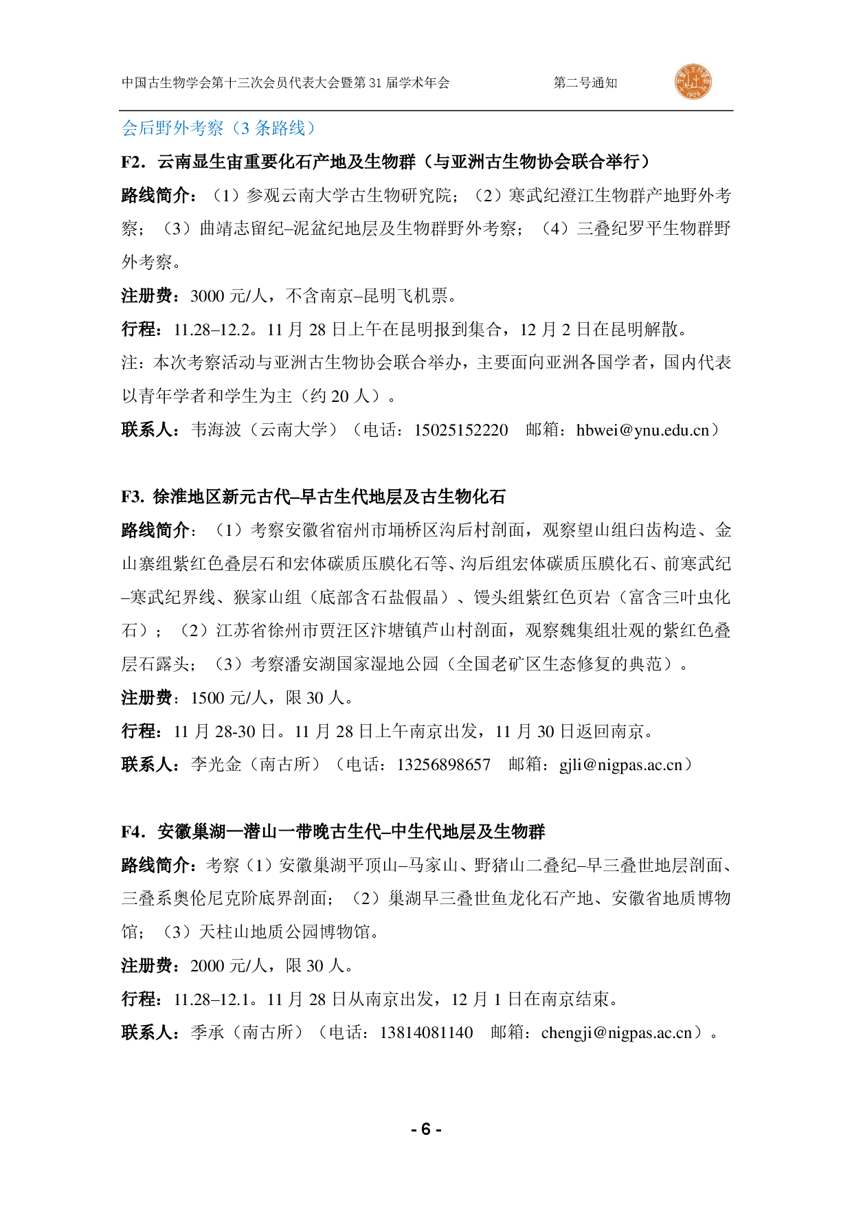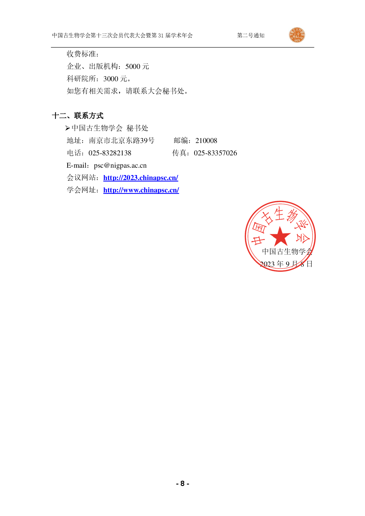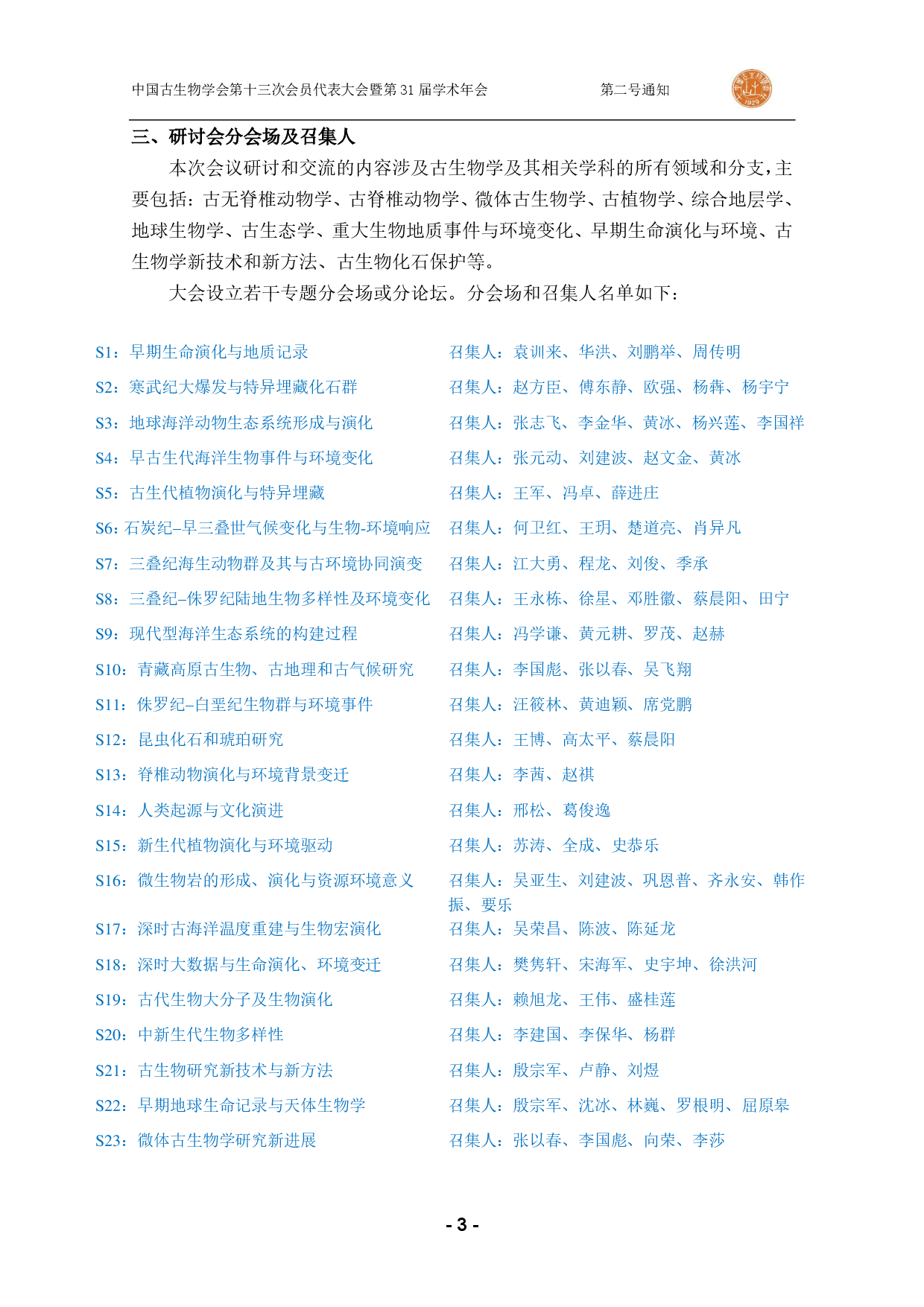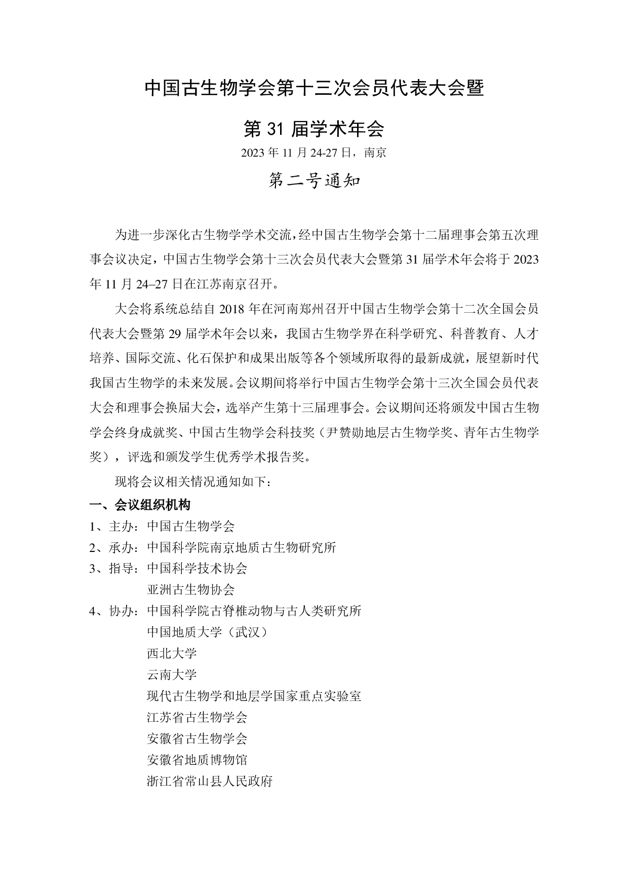 第二号会议通知-中国古生物学会第十三次会员代表大会暨第31届学术年会(第二号通知)