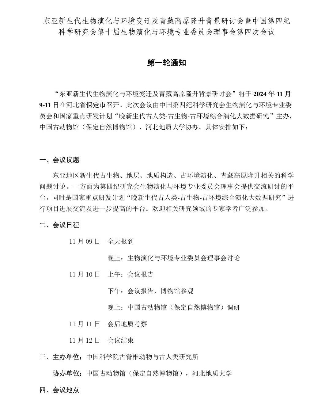 东亚新生代生物演化与环境变迁及青藏高原隆升背景研讨会暨中国第四纪科学研究会第十届生物演化与环境专业委员会理事会第四次会议(第一轮通知)