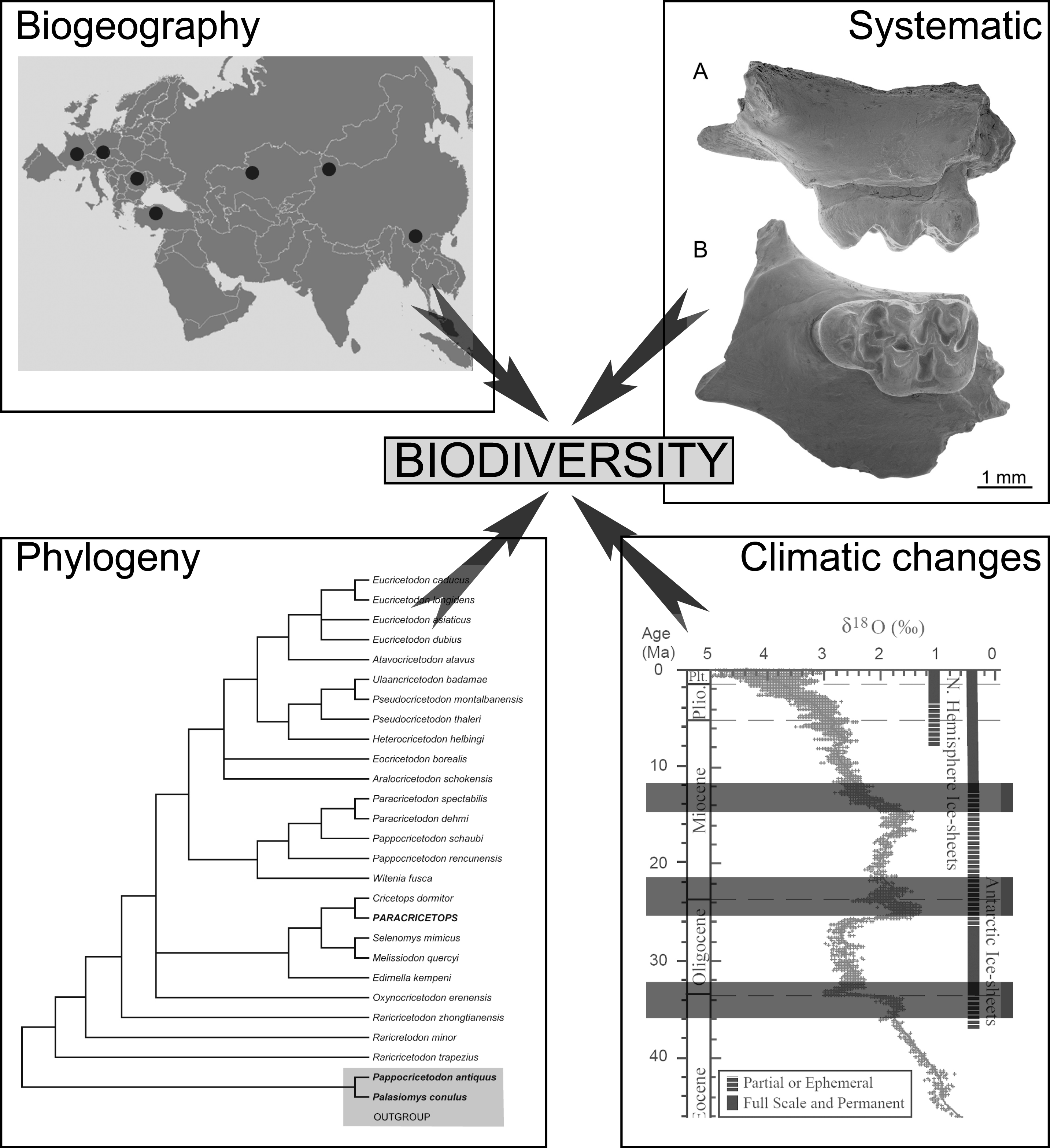 主要内容:以欧亚大陆新生代啮齿类为对象,研究了气候变化对其多样化机制及地理分布和物种交流的影响。研究发现啮齿类的扩散始于晚始新世,而非传统所认为的早渐新世。晚渐新世气候回暖很可能重新促进了欧亚大陆物种交流,是控制仓鼠在大的空间尺度上多样化交流的主要因素。仓鼠首先在亚洲分化并扩散,而后进入欧洲开始二次多样化;而鼩鼱在欧洲大陆的到达和多样化则是同步的。