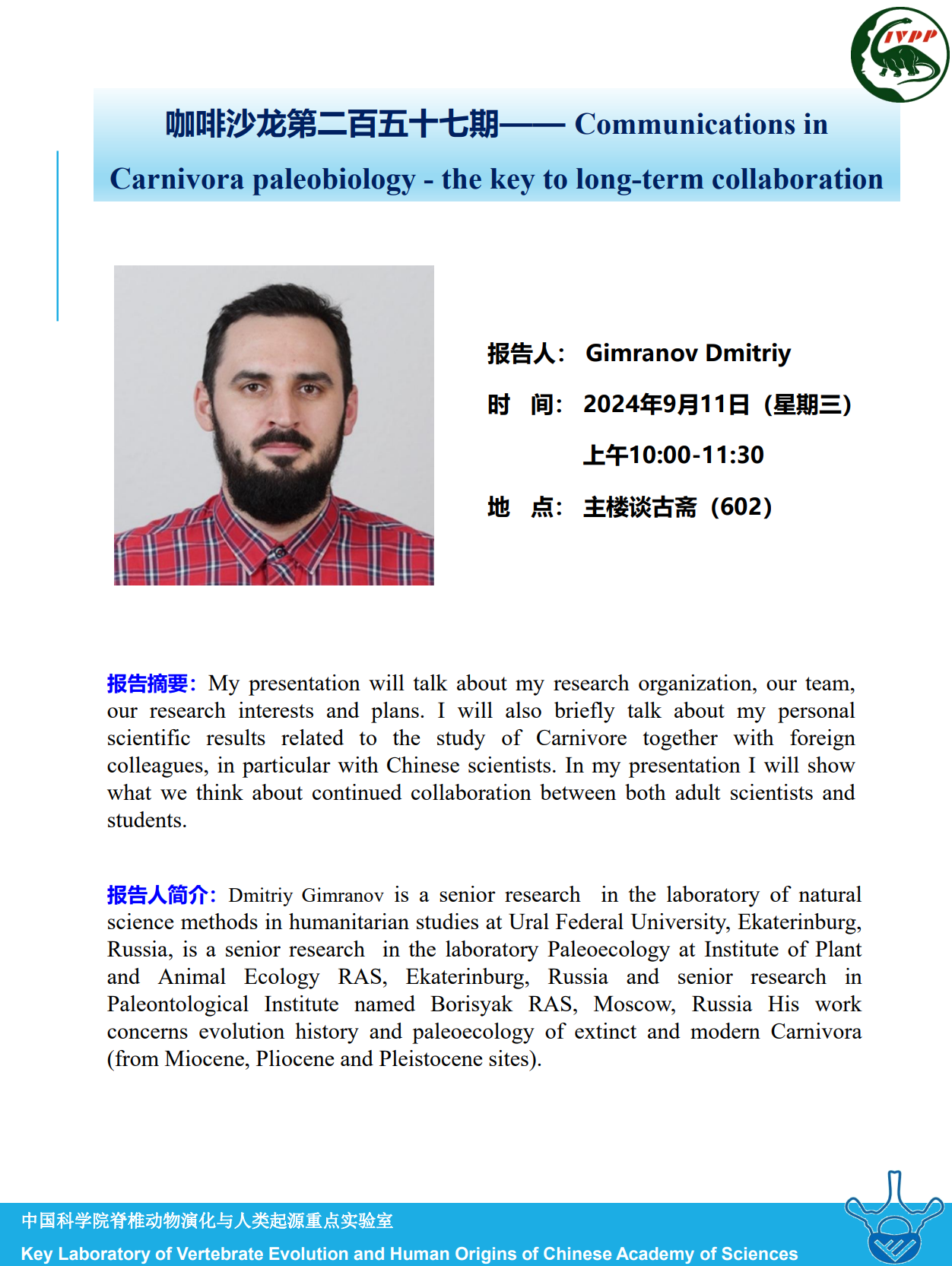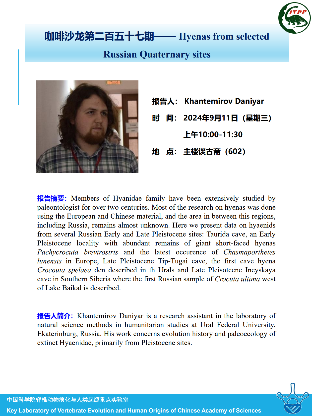 咖啡沙龙第二百五十七期——(一) Hyenas from selected Russian Quaternary sites(二)Сommunications in Carnivora paleobiology - the key to long-term collaboration