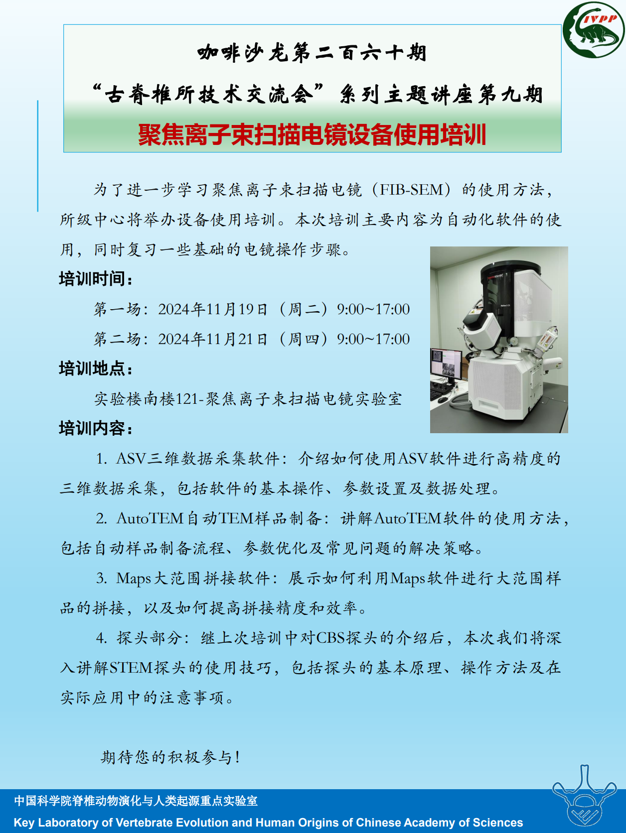 咖啡沙龙第二百六十期——“古脊椎所技术交流会”系列主题讲座第九期——聚焦离子束扫描电镜设备使用培训