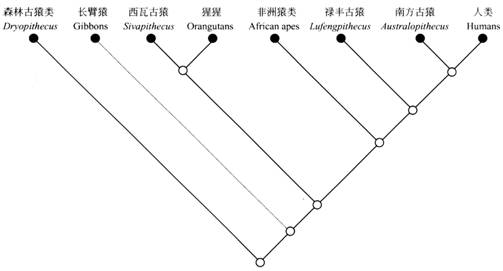 图1 主张禄丰古猿是早期人科成员的学者提出的人猿超科关系分支图