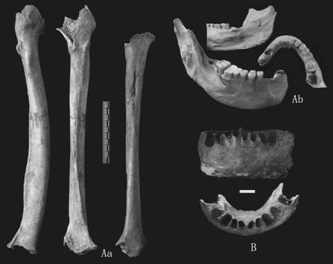 图2 近年在北京周口店田园洞(Aa & Ab)和广西崇左木榄山(B)发现的古人类化石