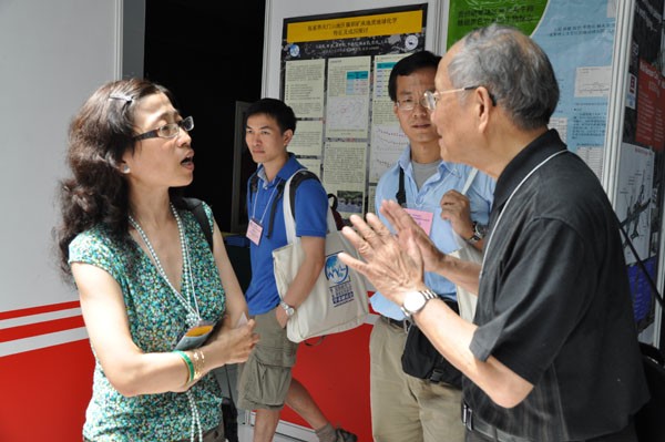 图一:汪品先院士与侯亚梅研究员进行展板内容的交流