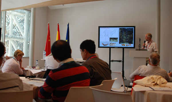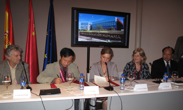 8日,中国科学院古脊椎动物与古人类研究所副所长高星、周口店遗址博物馆馆长杨海峰代表中方与西班牙卡斯蒂利亚-莱昂自治区政府、西班牙布尔戈斯人类发展博物馆签署了《周口店遗址博物馆(北京,中国)和人类发展博物馆(布尔戈斯,西班牙)成为姊妹博物馆文件》,这将进一步促进双方在遗址保护、博物馆文化交流、人员培养等方面的深入合作(图4、5)。与会代表还在9日傍晚分组参观了中国馆、法国馆、英国馆和意大利馆,共同畅享世博会的热烈和激情。1 0日傍晚全体代表前往复旦大学生命科学院开展学术交流,中方的金力教授和西班牙的阿苏阿佳教授分别就基因学人种方面的最新研究成果和人类进化做了主题演讲。