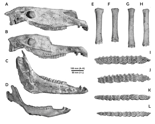 图1:下层(A,C,E,G,I,K)与上层(B,D,F,H,J,L)埃氏马化石的头骨(A,B),下颌(C,D),第三掌骨(E,F),第三蹠骨(G,H),上颊齿列(I,J)与下颊齿列(K,L)(王世骐供图)