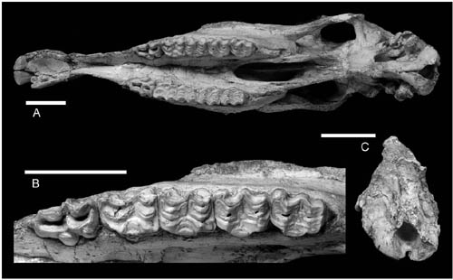 图3:长鼻三趾马头骨(HMV1872),A 腹视,B颊齿咬合面视,C 头骨后枕视,比例尺5厘米。(邓涛供图)