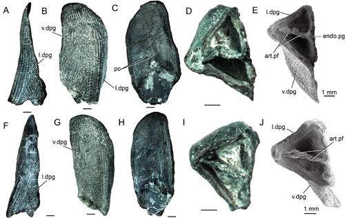 中国近年来一系列化石发现(如斑鳞鱼、无孔鱼、蝶柱鱼、鬼鱼等)为研究硬骨鱼纲起源与早期演化不断注入新的活力。为揭示早期硬骨鱼类腰带的结构,朱敏等对鬼鱼和斑鳞鱼材料进行了重新研究并多次开展新的野外发掘。他们于2010年发现了一件保存完好的鬼鱼新标本,该标本虽然头部缺失,但是头后部分保存十分精美。新标本的肩带保存了两侧的匙骨、锁骨以及一件菱形的间锁骨。与斑鳞鱼相同,鬼鱼发育的肩胛乌喙骨紧附于匙骨内侧面。引人注目的是,鬼鱼新标本上具有一件腹视的右侧腰带外骨骼,呈自然状态保存,该骨片上有一向后腹方延伸的棘刺,位于第二背鳍棘的腹侧。对鬼鱼正型标本(2009年发现)重新检查后,朱敏等发现正型标本上也保存了一件位于相似位置的左侧腰带外骨骼,结构与新标本相同。对鬼鱼腰带外骨骼进行的复原显示其腰带具有三块外骨骼,即一对腰带侧片和一块腰带间片。基于对鬼鱼腰带外骨骼的认识,朱敏等对斑鳞鱼头后骨骼进行了重新整理,结果发现了与鬼鱼腰带外骨骼相似的骨片,并且内侧与其愈合的内骨骼上还具有与肩带相似的复基鳍关节。这表明斑鳞鱼的腰带与肩带结构相似,也说明鬼鱼的腰带很可能同样具有复基鳍关节。作为首批保存了腰带外骨骼的硬骨鱼类化石记录,鬼鱼和斑鳞鱼揭示了出乎预料的腰带形态特征,这些特征指示鬼鱼与斑鳞鱼腰带的整体结构与一些盾皮鱼类相近。